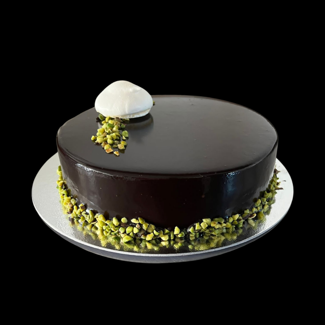 Layers of dark chocolate and pistachio mousse, pistachio praline crunch, and chocolate sponge cake, all covered with a dark chocolate glaze and decorated with chopped pistachios. This dessert is an absolute explosion of flavours!