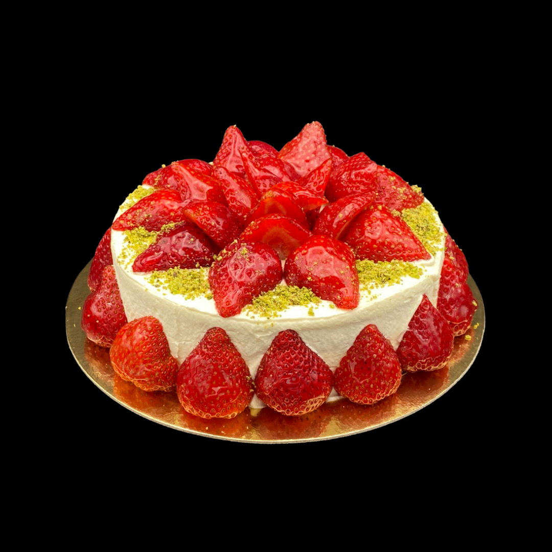 Our Strawberry cake is made with sponge, chantilly cream, strawberries and pistachio nibs.