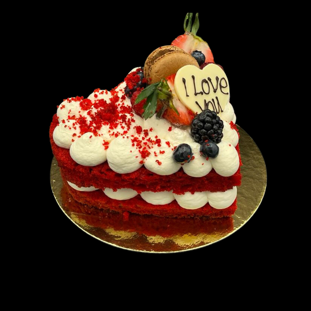 This soft, delicious, heart-shaped Red Velvet is perfect for you and your significant other. Give the gift of cake in the shape of love. Sponge Cake, Cream Cheese, Fresh fruit and Macaroons